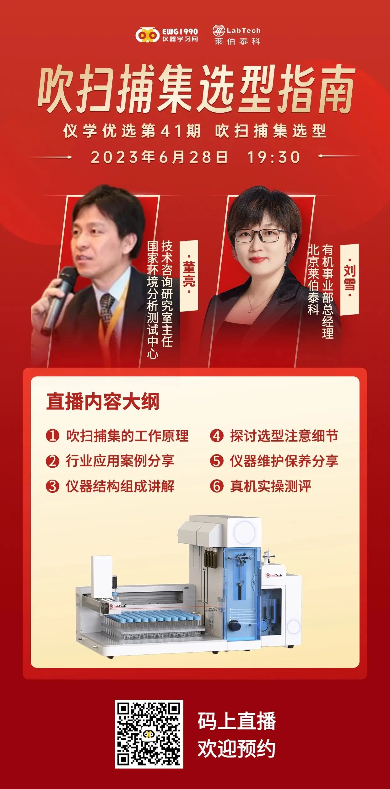 6月28日19:30,萊伯泰科將攜手國(guó)家環(huán)境分析測(cè)試中心技術(shù)咨詢(xún)研究室主任董亮老師,為大家?guī)?lái)一場(chǎng)關(guān)于吹掃捕集儀的選型指南直播。本次直播將圍繞吹掃捕集儀的工作原理、主要應(yīng)用場(chǎng)景、環(huán)境監(jiān)測(cè)領(lǐng)域使用吹掃捕集的標(biāo)準(zhǔn)分析方法現(xiàn)狀以及儀器選型時(shí)的關(guān)鍵點(diǎn)展開(kāi)深入探討。