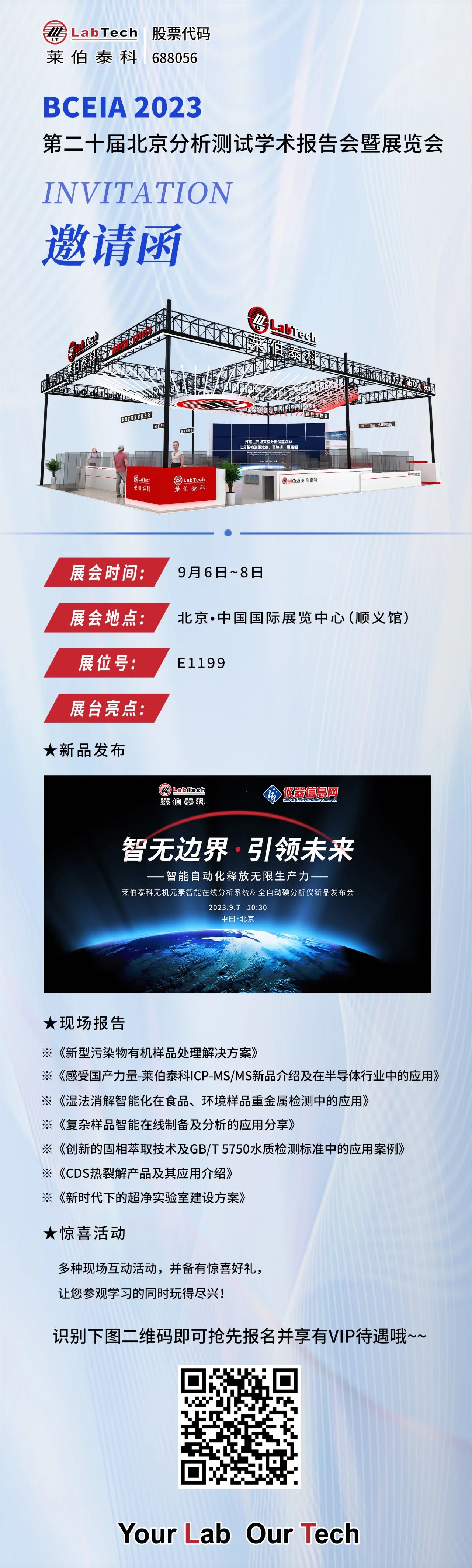2023年9月6日,第二十屆北京分析測(cè)試學(xué)術(shù)報(bào)告會(huì)暨展覽會(huì)(BCEIA 2023)即將盛大開幕。今年,是萊伯泰科第十一次參加BCEIA盛會(huì),萊伯泰科將以更加飽滿的活力和激情,攜全線產(chǎn)品亮相本次展會(huì),期間更有重磅新品現(xiàn)場(chǎng)發(fā)布,讓您親身體驗(yàn)萊伯泰科最新的科技成果和產(chǎn)品創(chuàng)新。