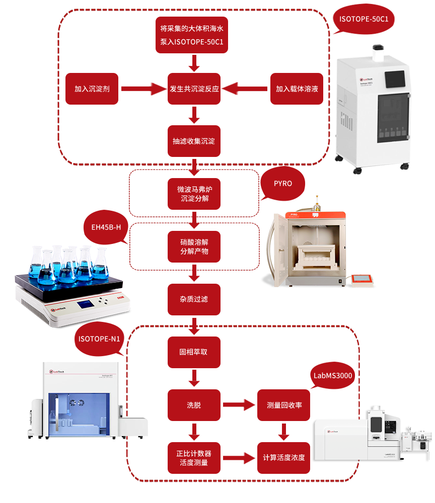 方案融合了多款自動化前處理設備和分析儀器,包括全自動核素固相萃取裝置、共沉淀分離裝置、高效核素分離系統(tǒng)以及電感耦合等離子體質譜儀。這些儀器設備的協(xié)同作用,能夠實現(xiàn)海水中放射性元素的快速分離、樣品制備和檢測,使整個檢測過程更加智能高效。
