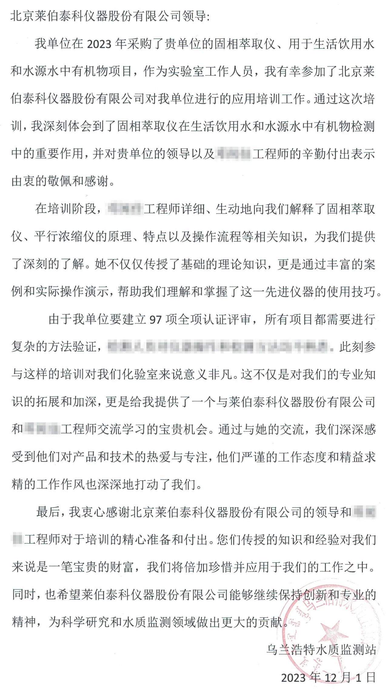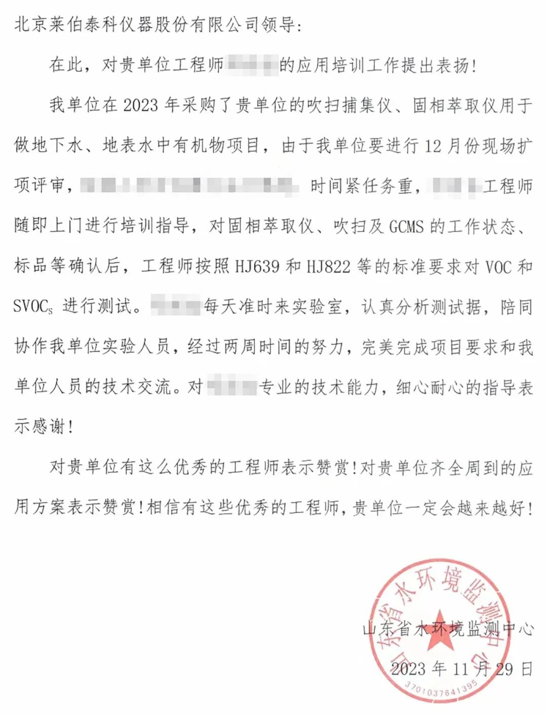 近日,北京萊伯泰科儀器股份有限公司(以下簡稱“萊伯泰科”)陸續(xù)收到來自山東省水環(huán)境監(jiān)測中心及內(nèi)蒙烏蘭浩特水質(zhì)監(jiān)測站的兩封感謝信。這兩封信件充分肯定了萊伯泰科工程師在項目支持中所表現(xiàn)出的專業(yè)技術能力和出色的服務精神,并對萊伯泰科提供的整體解決方案給予了高度評價。這一客戶的認可再次體現(xiàn)了萊伯泰科一貫秉承的“客戶至上”服務理念,也再次凸顯了公司在軟實力及客戶服務方面的卓越表現(xiàn)。