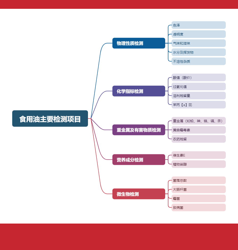 食用油作為日常烹飪的必需品,是餐桌上不可或缺的一部分,其檢測項(xiàng)目眾多,詳細(xì)檢測內(nèi)容請參見下圖。