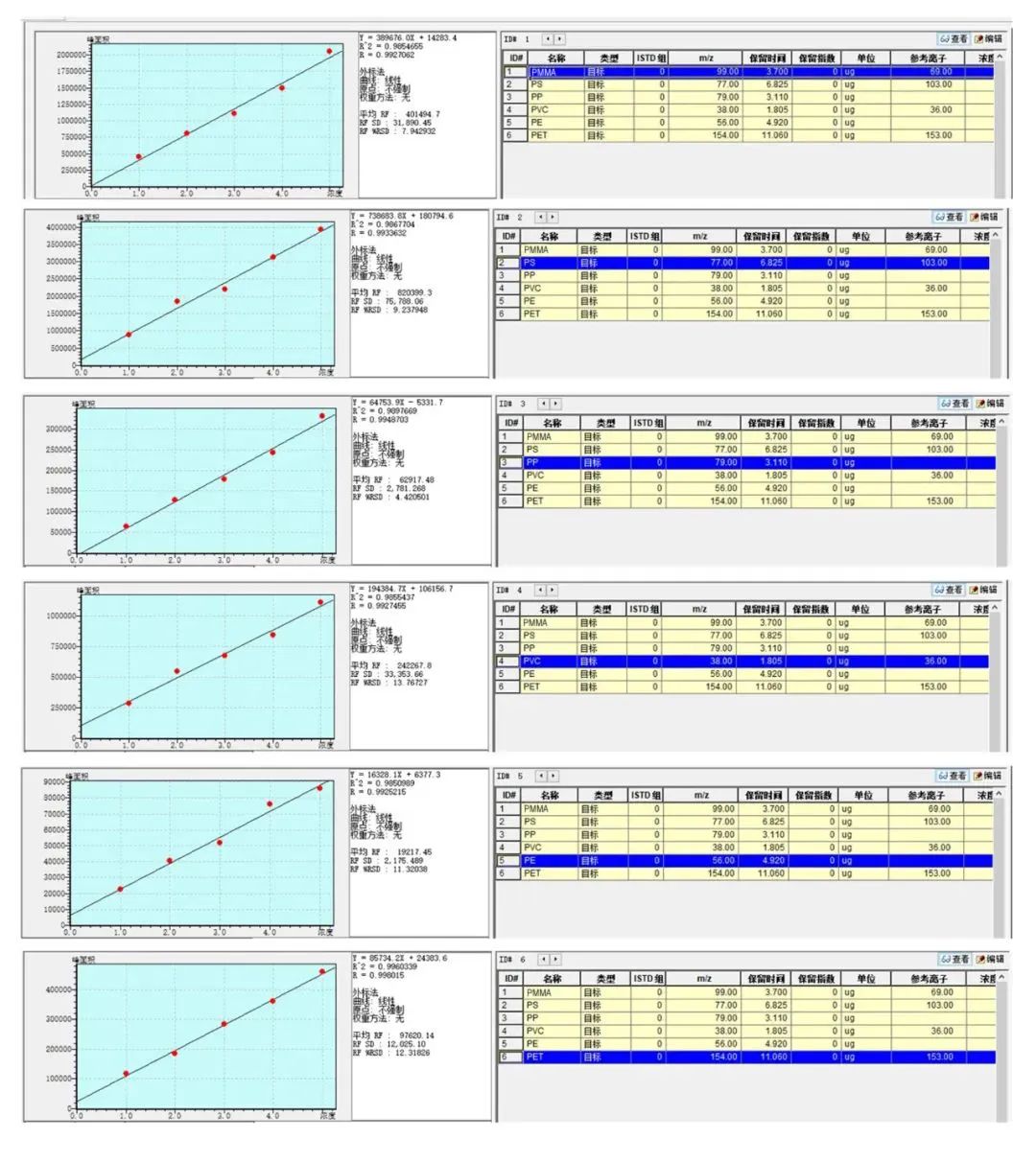 塑料高溫高壓在有機(jī)溶劑萃取后,仍然不是溶液狀態(tài),實(shí)際是懸濁液,只是塑料的顆粒極其小,在充分晃動(dòng)后,6種微塑料顆粒在溶劑中能均勻分散。則盡量取大體積進(jìn)樣,則分析穩(wěn)定性會(huì)更好。CDS Pyroprobe6150的樣品管為20μL ,取滿1個(gè)樣品管為1μg,則可反復(fù)蒸發(fā)干和再加入方式,可分別取1~5管,則為1μg、2μg、3μg、4μg、5μg 。