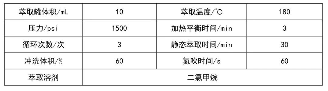 用天平分別稱取2mg各微塑料,利用高溫高壓萃取方式進(jìn)行溶解,高壓萃取罐10mL , 萃取溫度180℃ ,高壓1500psi ,每次萃取時(shí)間30min ,萃取3次,萃取溶劑為二氯甲烷,最終溶劑定容40mL。