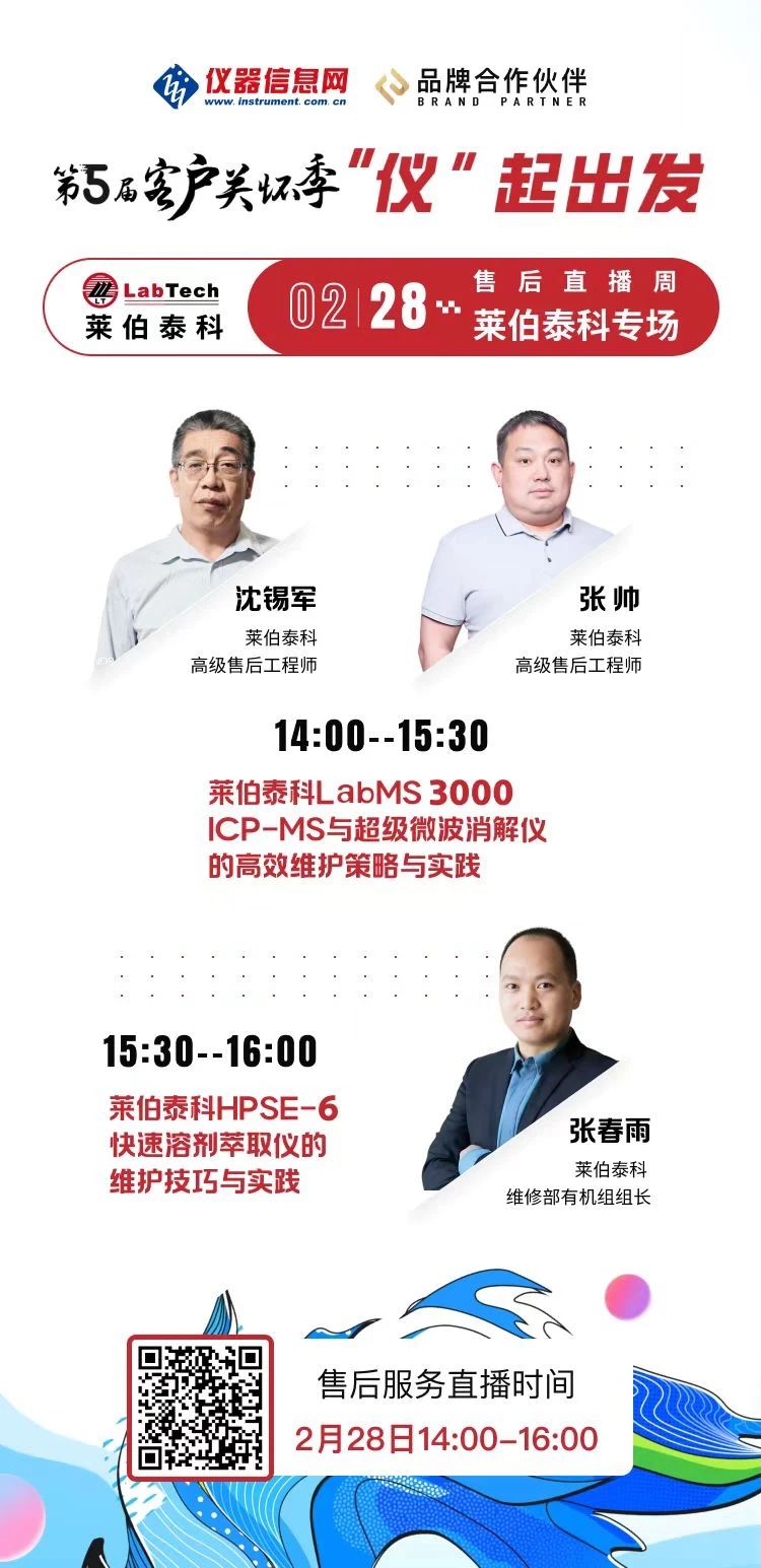 本場直播,將由萊伯泰科高級售后工程師沈錫軍與張帥,以及維修部組長張春雨為大家做線上分享,帶來了《萊伯泰科LabMS 3000 ICP-MS與超級微波消解儀的高效維護策略與實踐》與《萊伯泰科HPSE-6快速溶劑萃取儀的維護技巧與實踐》兩場報告。
