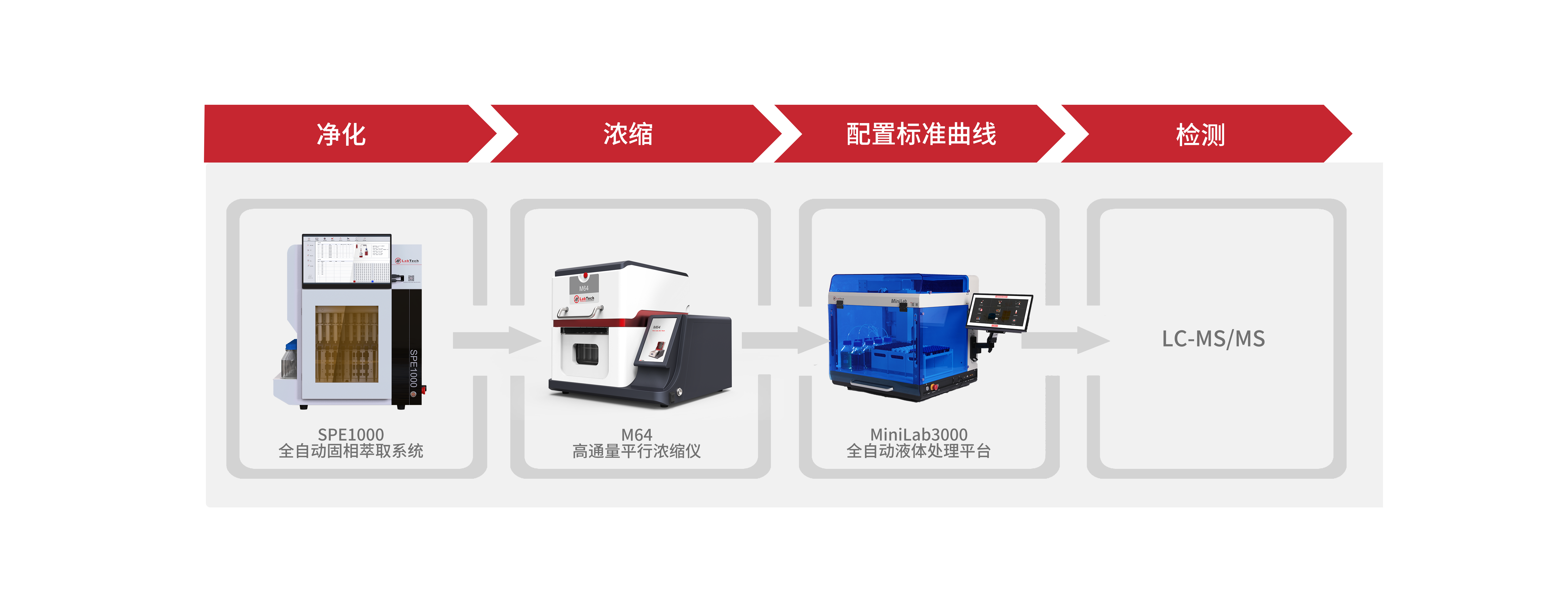 該方案可以實現(xiàn)自動化、高通量的萃取和濃縮,有效避免和減少有機試劑對分析人員造成的健康危害,減少人員用量、減少人為誤差,提高實驗效率。檢測結(jié)果證明使用萊伯泰科的全自動固相萃取萃取,高通量平行濃縮儀濃縮,方法準確性好、精密度高、可以實現(xiàn)高通量自動化的檢測。