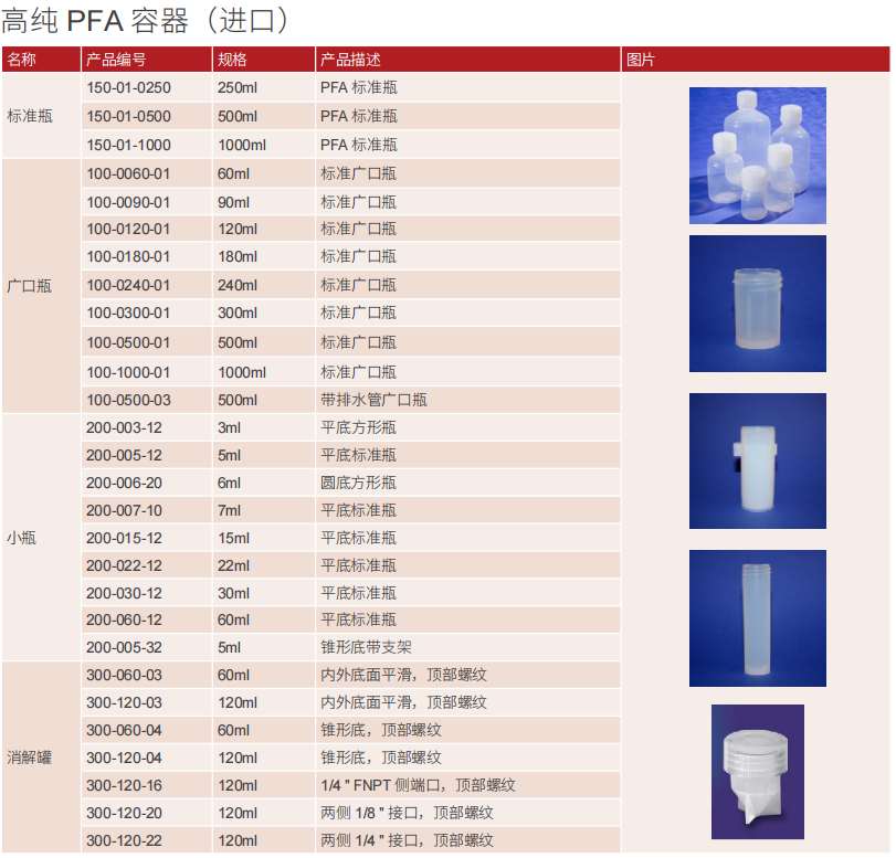 PFA 或全氟烷氧基是 FEP 的高溫版本。PFA 具有與 FEP 相似的特性,但由于其熔體粘度低于 PTFE,因此可以在工作溫度上限達 + 260℃的環(huán)境下使用,同時保持可熔融加工。PFA 具有優(yōu)良的化學耐受性,并且可在較寬的溫度范圍內(nèi)穩(wěn)定工作。PFA 呈半透明,柔韌,并且由于其高密度而感覺很重。PFA 具有惰性和低粘合性,溶出物和痕量金屬含量較低。它具有較寬的含氟聚合物溫度范圍,從 - 270°C 到 +260℃,在整個范圍內(nèi)具有良好的化學耐受性。PFA 樣品瓶是需要高靈敏度的應用的理想選擇。這些產(chǎn)品是半導體生產(chǎn)和微采樣的優(yōu)質(zhì)選擇。