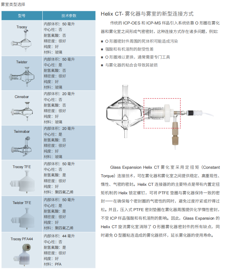 霧室是 ICP 進樣系統(tǒng)的另一個關鍵組成部分,直接影響了進樣系統(tǒng)的霧化效率、精度和洗出時間。GE 的 Tracey 和Twister 旋流霧化室改進了 ICP 霧化室的傳統(tǒng)設計,提高了霧化效率,降低了洗出時間。Glass Expansion 獨特的Helix CT 霧化器連接方式,零死體積,可提高樣品通量。