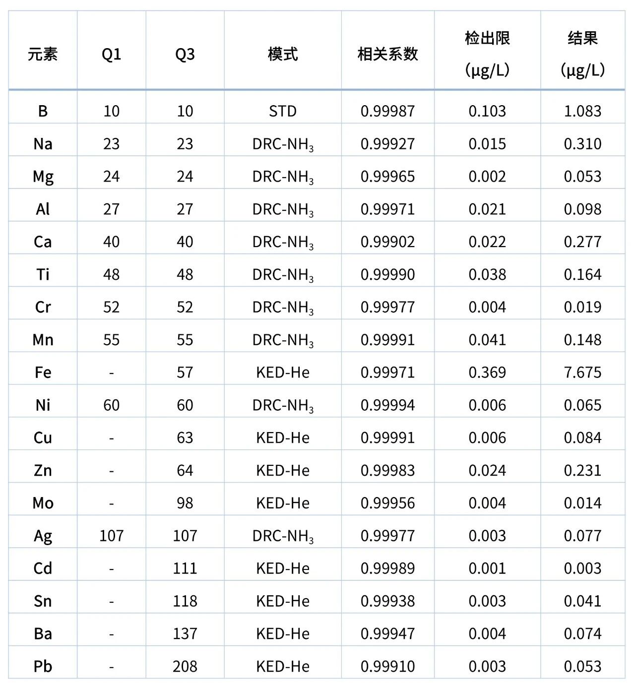 檢測(cè)結(jié)果所示,待測(cè)元素的標(biāo)準(zhǔn)曲線相關(guān)系數(shù)均大于 0.999,線性良好,滿足痕量元素定量分析的基本要求;背景等效濃度(BEC)與檢出限(DL)處于極低水平,其中 Cd、Cr、Mo、Ag 等元素檢出限低至 0.001~0.004 μg/L,Na、Mg、Ni 等關(guān)鍵催化劑毒物檢出限也均低于 0.022 μg/L。