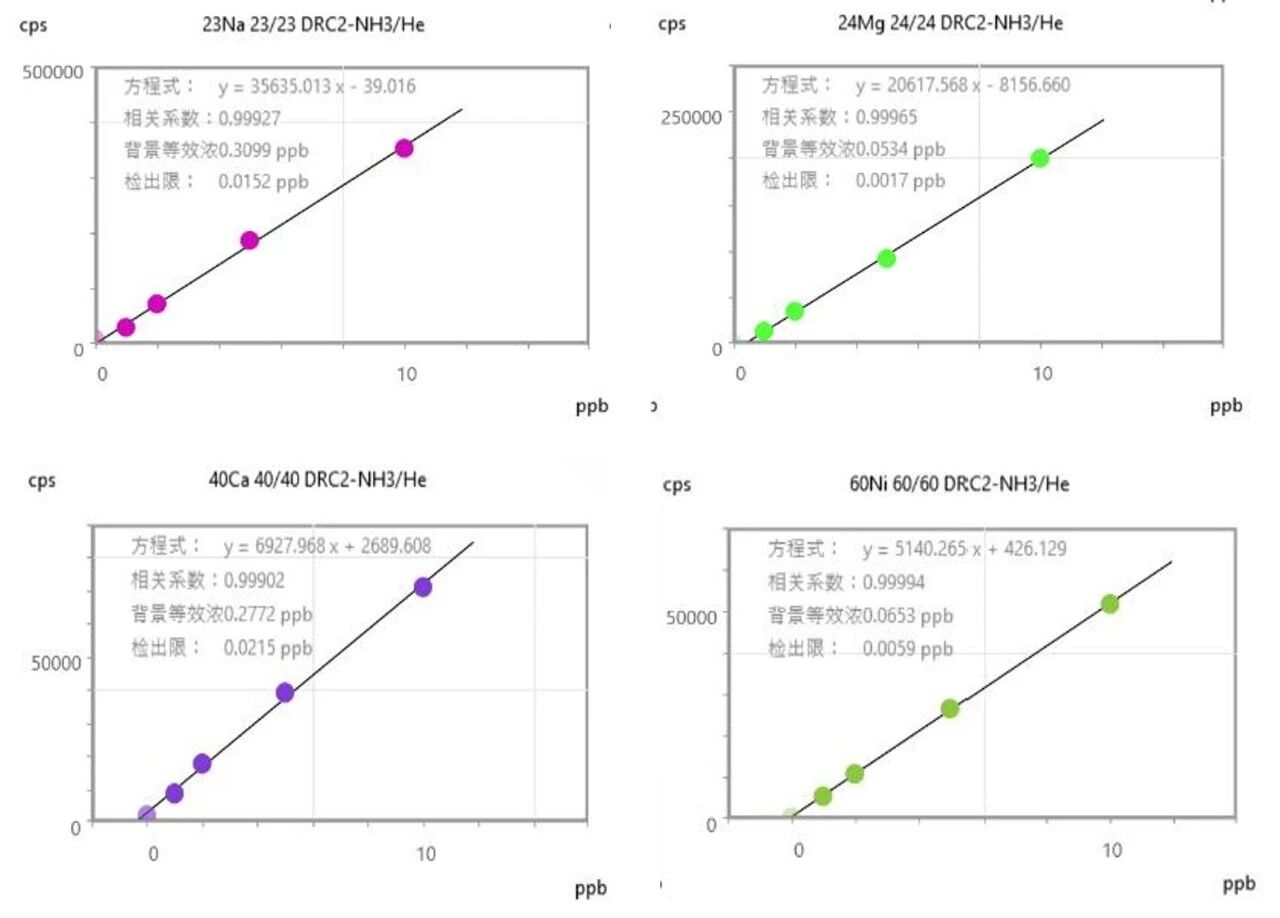 因此針對(duì)Mg、Ca、Ni 等易干擾的元素,LabMS 5000 ICP-MS/MS采用DRC-NH?模式(on mass),可通過電荷轉(zhuǎn)移或質(zhì)量轉(zhuǎn)移反應(yīng)消除干擾,同時(shí) Ca?、Mg? 等與 NH? 反應(yīng)活性低,得以保留,大幅降低了背景信號(hào)干擾,實(shí)現(xiàn)了目標(biāo)離子的精準(zhǔn)檢測(cè)。