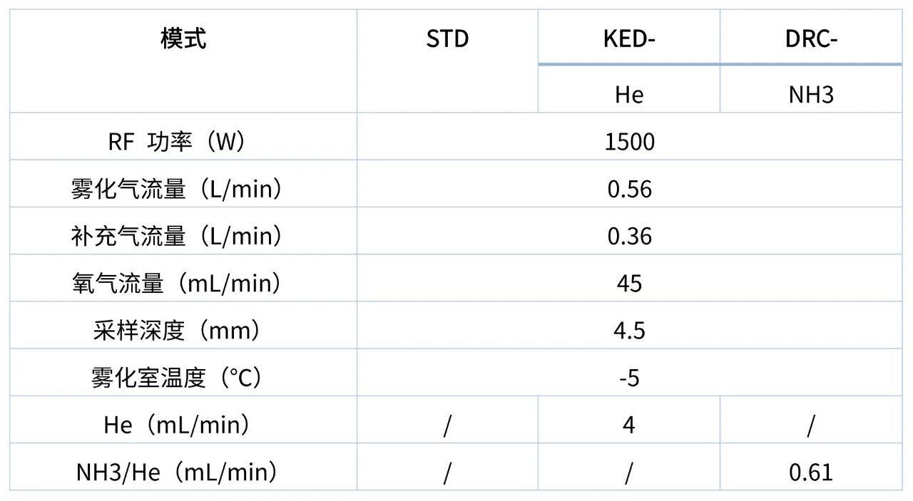 LabMS 5000 ICP-MS/MS配備石英霧化器、帶有控溫附件的石英霧化室、石英炬管及中心管、Pt采樣錐和截取錐。在本實(shí)驗(yàn)中,采用多種碰撞反應(yīng)池氣體(He、NH3)。詳細(xì)儀器參數(shù)如表1所示。