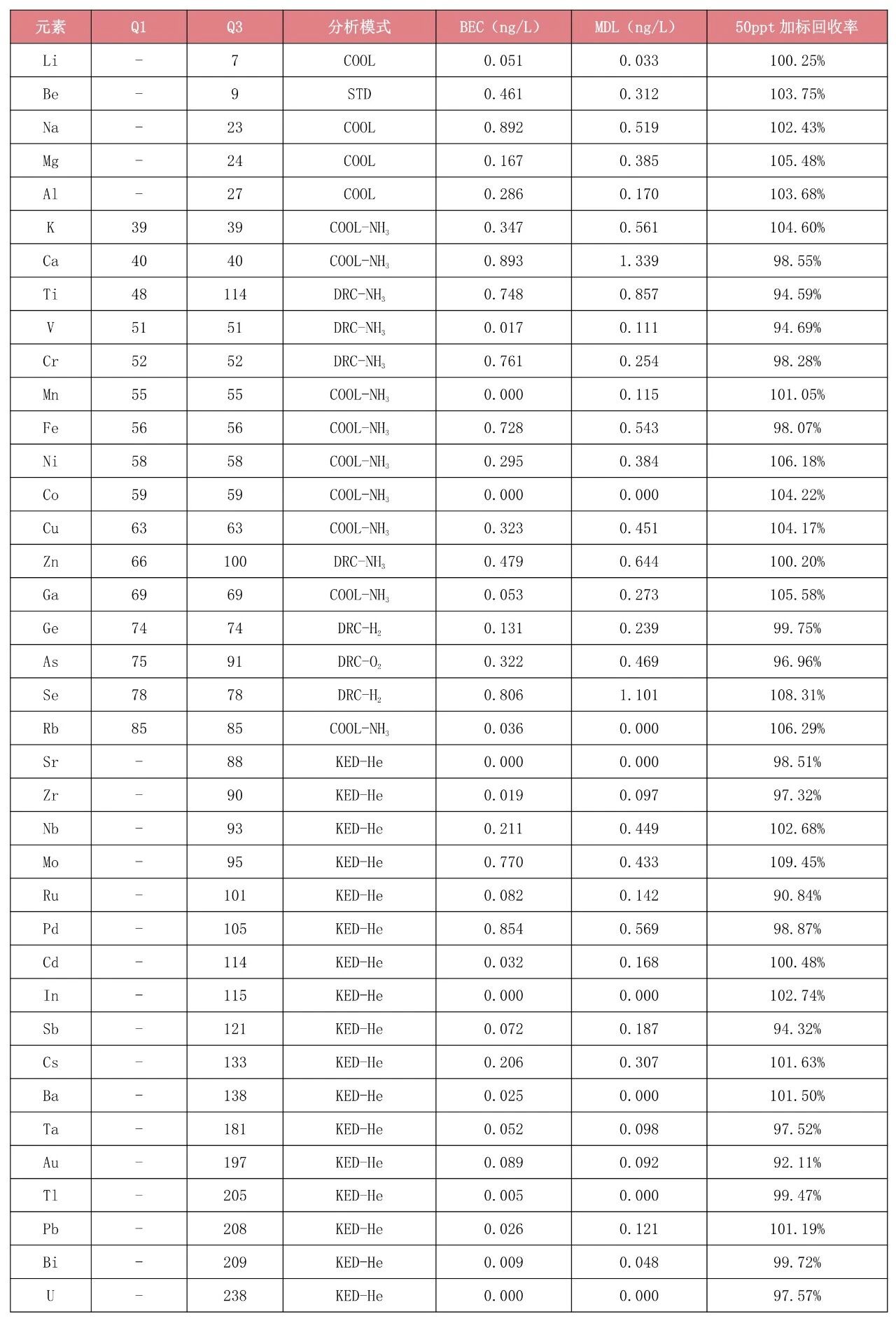 LabMS 5000具有多種干擾消除模式,可根據(jù)不同應(yīng)用需求靈活選擇,針對不同元素優(yōu)化最適宜的分析模式。在一個方法中使用7種分析模式測試9.8%硫酸中38 種痕量雜質(zhì)元素,背景等效濃度(BEC)在ppt及亞ppt級別,50ppt加標樣品回收率在90%~110%之間,驗證了儀器能夠準確測定高純硫酸中痕量雜質(zhì)元素含量。