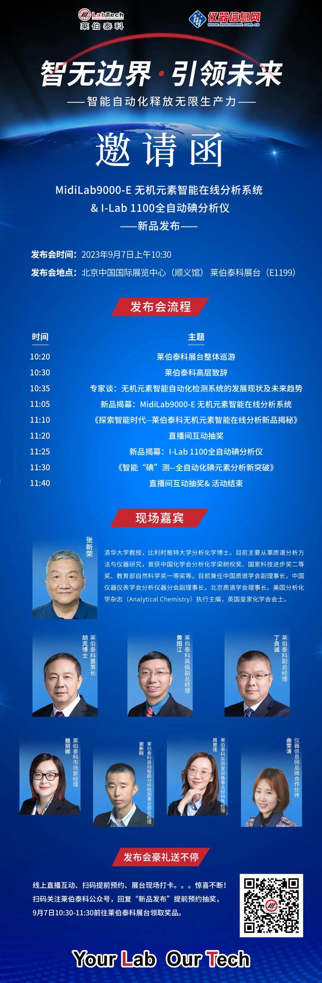 萊伯泰科即將于2023 BCEIA展會期間舉辦“智無邊界 引領未來--智能自動化釋放無限生產(chǎn)力”無機元素智能自動化分析新品發(fā)布會,發(fā)布萊伯泰科的兩款最新產(chǎn)品:MidiLab9000-E無機元素智能在線分析系統(tǒng)和I-Lab 1100全自動碘分析儀。