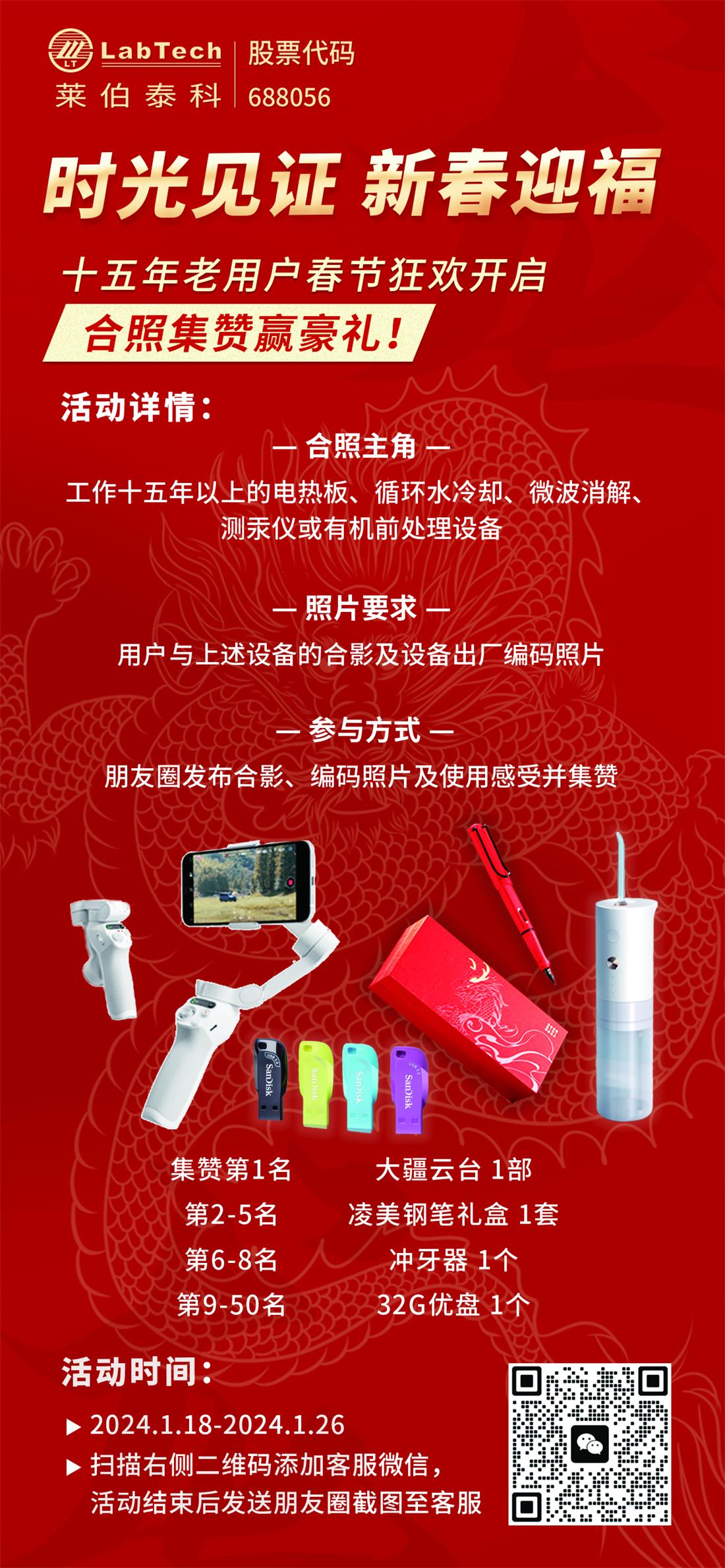 新年新氣象!值此春節(jié)臨近,我們特邀使用十五年以上電熱板、循環(huán)水冷卻、微波消解、測(cè)汞儀或有機(jī)前處理設(shè)備的老用戶參與迎新春活動(dòng)。讓我們一同用心捕捉美好瞬間,共同見證歲月的痕跡!