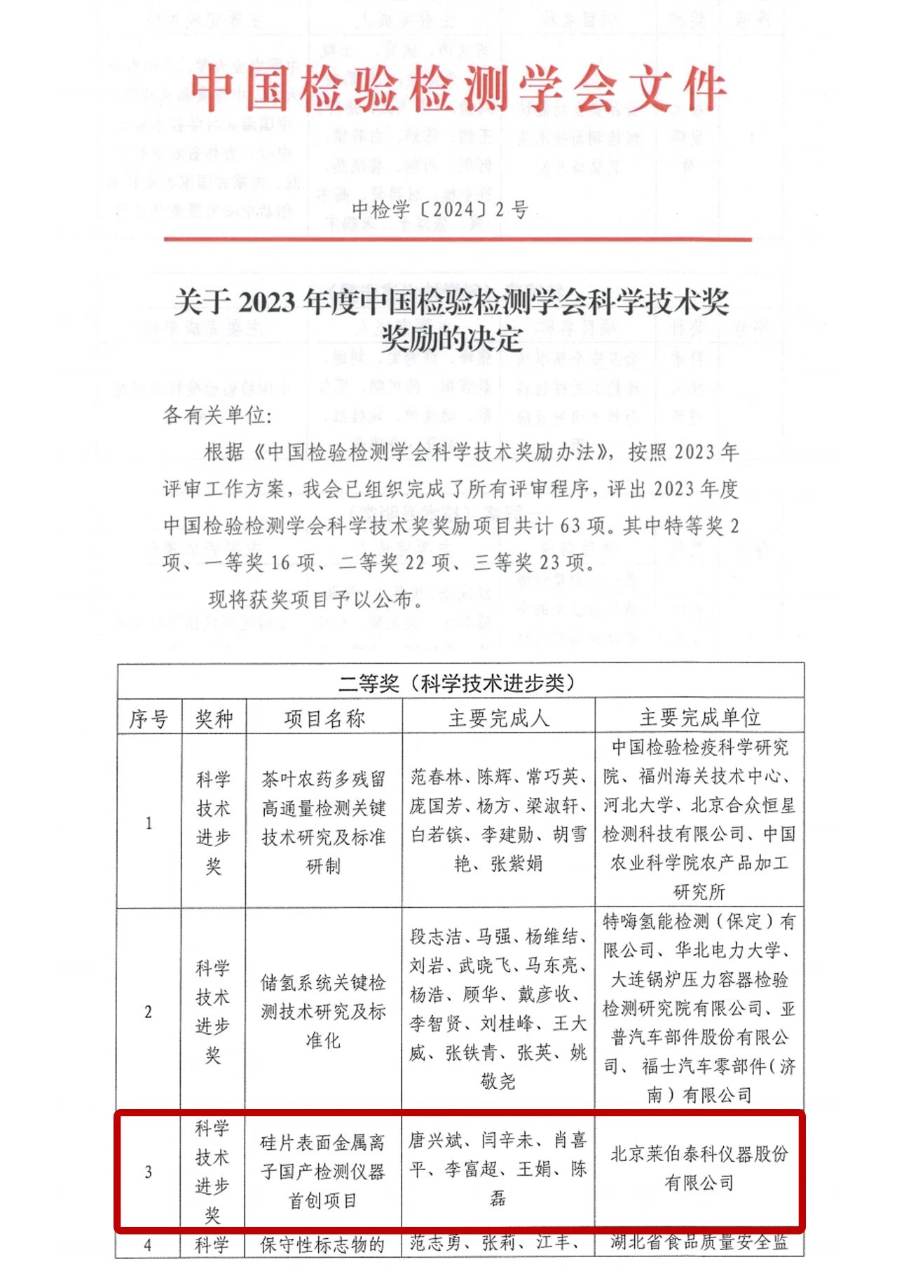 近期,“2023年度中國檢驗檢測學(xué)會科學(xué)技術(shù)獎”獲獎名單公布,北京萊伯泰科儀器股份有限公司(簡稱“萊伯泰科”)憑借其《硅片表面金屬離子國產(chǎn)檢測儀器首創(chuàng)項目》榮獲科學(xué)技術(shù)進(jìn)步獎二等獎。
