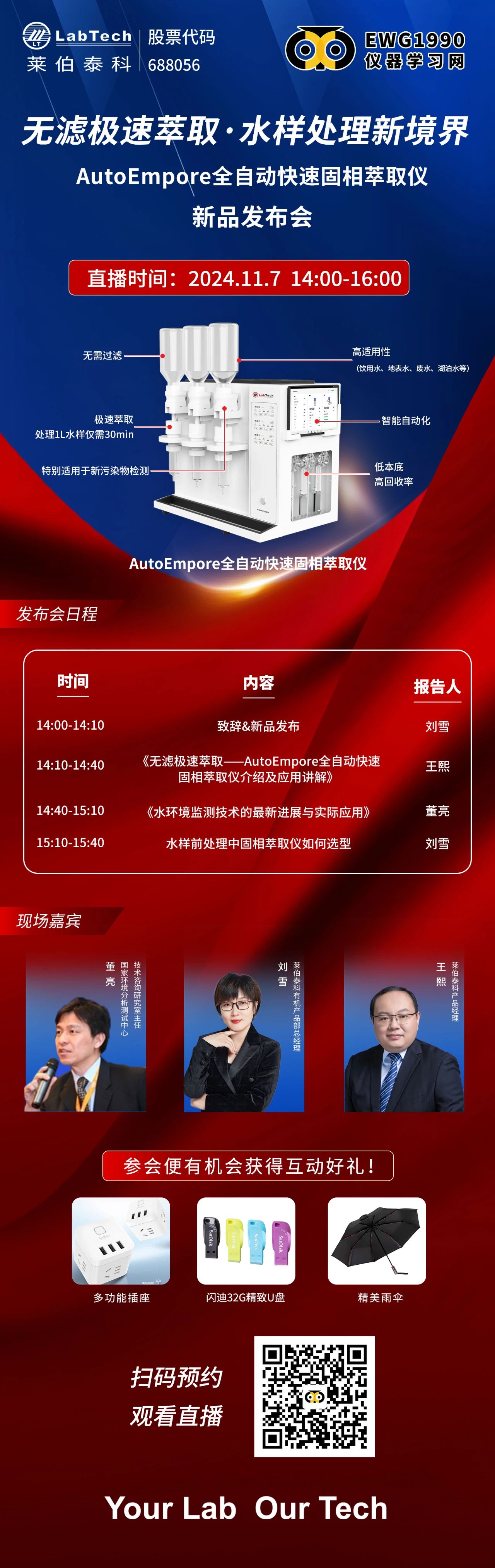 萊伯泰科將于11月7日盛大舉辦“無濾極速萃取 · 水樣處理新境界——AutoEmpore全自動快速固相萃取儀新品發(fā)布會”。此次發(fā)布會不僅標志著萊伯泰科在水樣前處理技術(shù)領(lǐng)域的又一重大突破,更將為環(huán)境監(jiān)測、水資源管理以及科研領(lǐng)域帶來更加高效的解決方案。