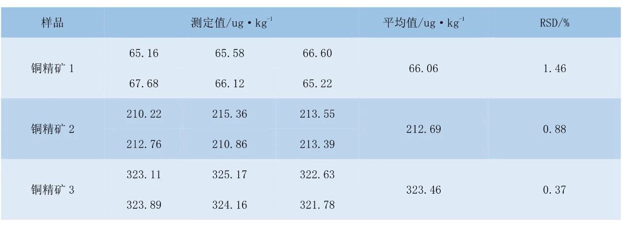 選取3個(gè)含不同濃度汞的銅精礦樣品,進(jìn)行6次平行測(cè)定,精密度試驗(yàn)結(jié)果見(jiàn)表3。